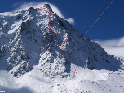 Ce week-end, Pierre enchaine avec « La Voie Mallory Porter ». Magnifique couloir/ goulotte dans la si visible et attirante face N de l’Aiguille du Midi. La Mallory sort juste en dessous de l’arête de sortie de l’Aiguille du Midi.