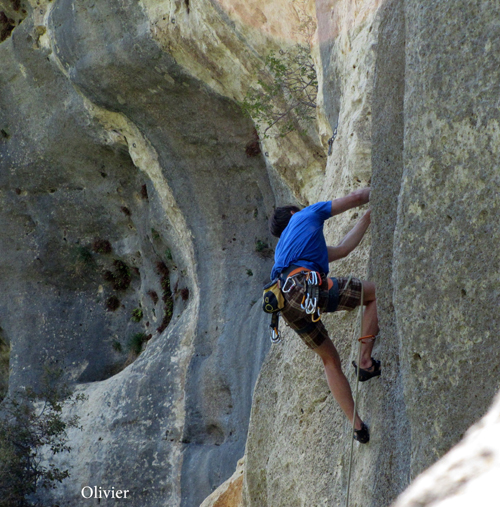 Vous ne serez donc pas surpris d’apprendre que la faune grimpante et pieuse, bien de chez nous, y soit allée faire son pèlerinage. C’est ainsi qu’à l’initiative de BE et BO, soient Thibault MEUNIER, notre B.E. secondé par le dynamique B.O. ( Benoît en l’occurrence ) que 12 membres de CAIRNS ont pris le chemin de Buoux. Il y avait bien sûr les jeunes grimpeurs entraînés par Thibault ( Camille, Claire, Noé, Olivier, Victor et Vincent ) mais, et c’est à relever, ils étaient accompagnés et véhiculés par un groupe amicalement qualifié de moins jeunes ( Benoît, Catherine, Guilhem, Janine, Jean Marc, Muriel )…A savoir que le club Altitude 137 mené par Fahad Aslam participait également. C’est donc au cours de ce séjour intergénérationnel ( du 28 avril au 4 mai 2012 ) que nos grimpeurs ont découvert Buoux. Escalade en dalles verticales..en dévers…engagée, souvent aérienne et éprouvante pour les doigts y compris ceux des pieds.Malgré la pluie du début de séjour les perfs furent au rendez-vous ( 7b+ pour Olivier, 7a pour Jean Marc et 6a pour Noé !) et l’ambiance fort conviviale. Un beau souvenir pour les participants.